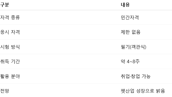 한국직업능력연구원에 등록되는 민간자격 과정 중 하나로, 반려동물의 건강·행동·위생·영양·훈련·산업 전반에 대한 전문 지식을 갖춘 전문가를 인증하는 자격입니다.